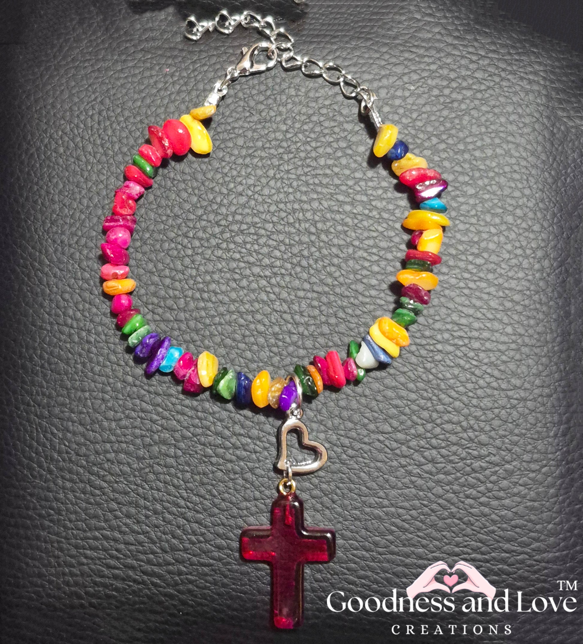 Inject a burst of joy and color into your everyday style with our 'Joyful Faith' bracelet! This stunning piece features a dazzling array of colorful, natural chip beads that catch the light and brighten any outfit. Draped below the vivid beads is a rich, red cross paired with a delicate heart, symbolizing faith and love. It measures 7".