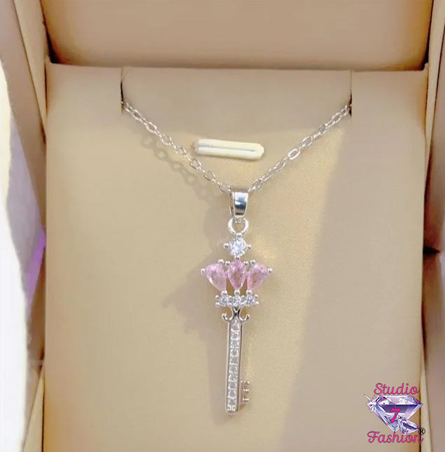 This beautiful necklace features a key charm with a pink rhinestone crown. Give this as a gift to your princess! The key measures .75" and the chain is 20".
